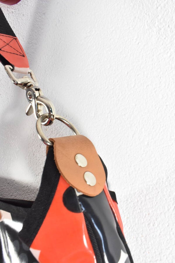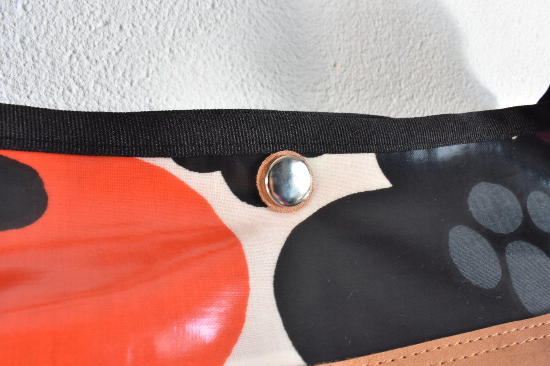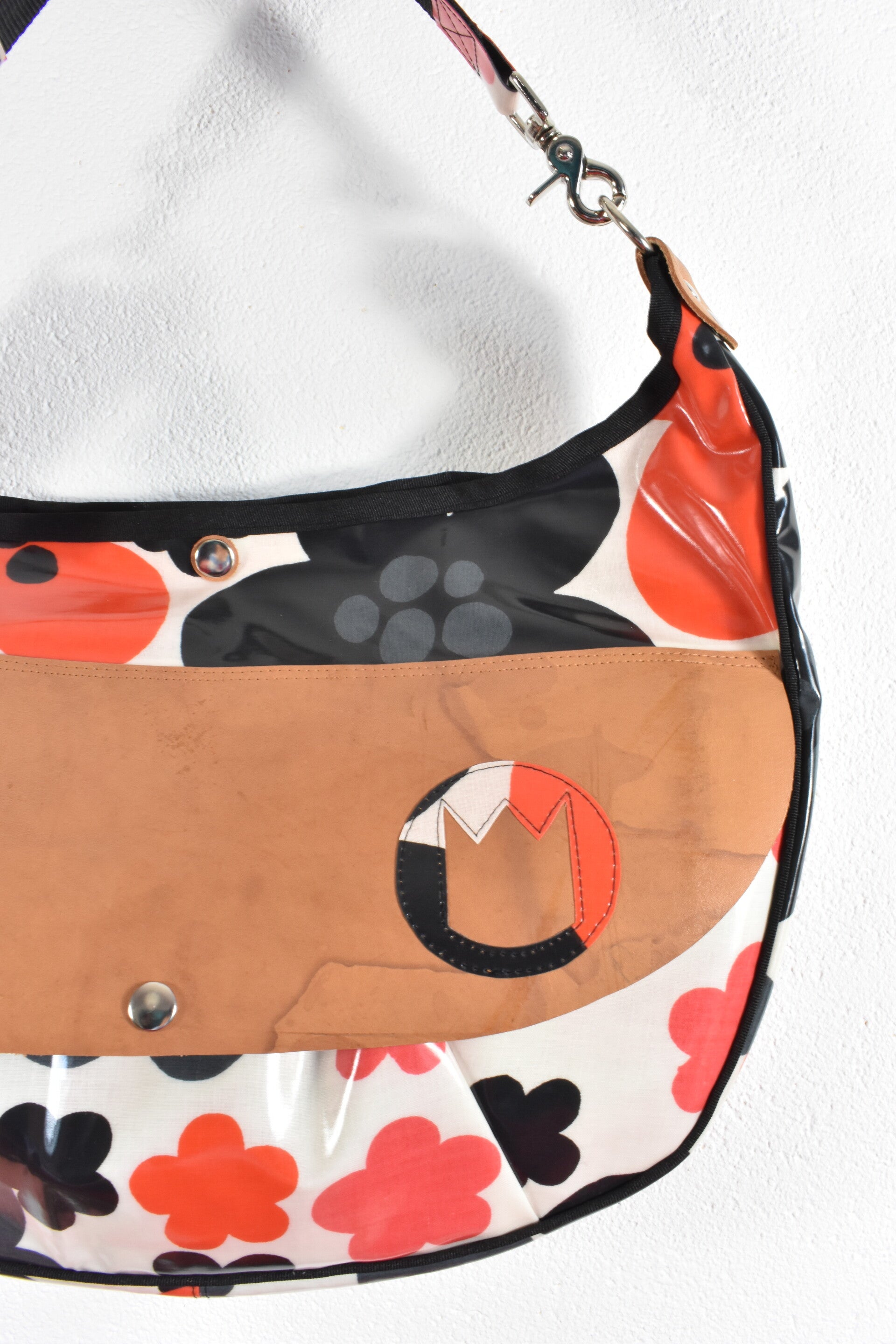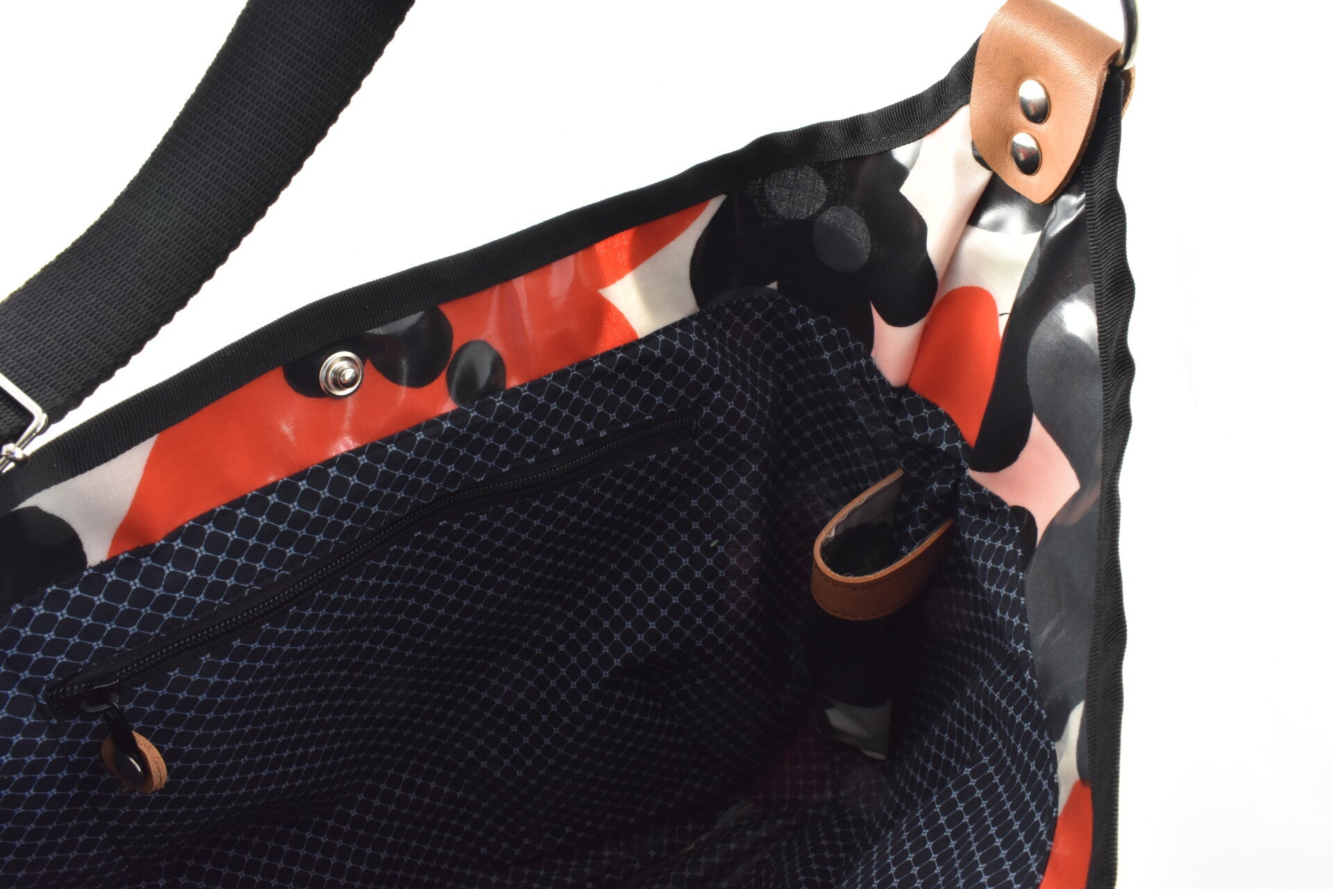 Kluge Else is een echte blikvanger! De schoudertas is gemaakt van een combinatie van kunststof tafelkleed en gerecycled turntoestelleer. De binnenvoering is passend van kleur en van vintage stof.